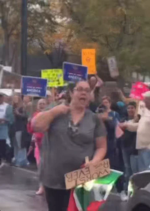 No Kings protestor with a Mexican flag gives a buIIet in the neck gesture to a Charlie Kirk fan