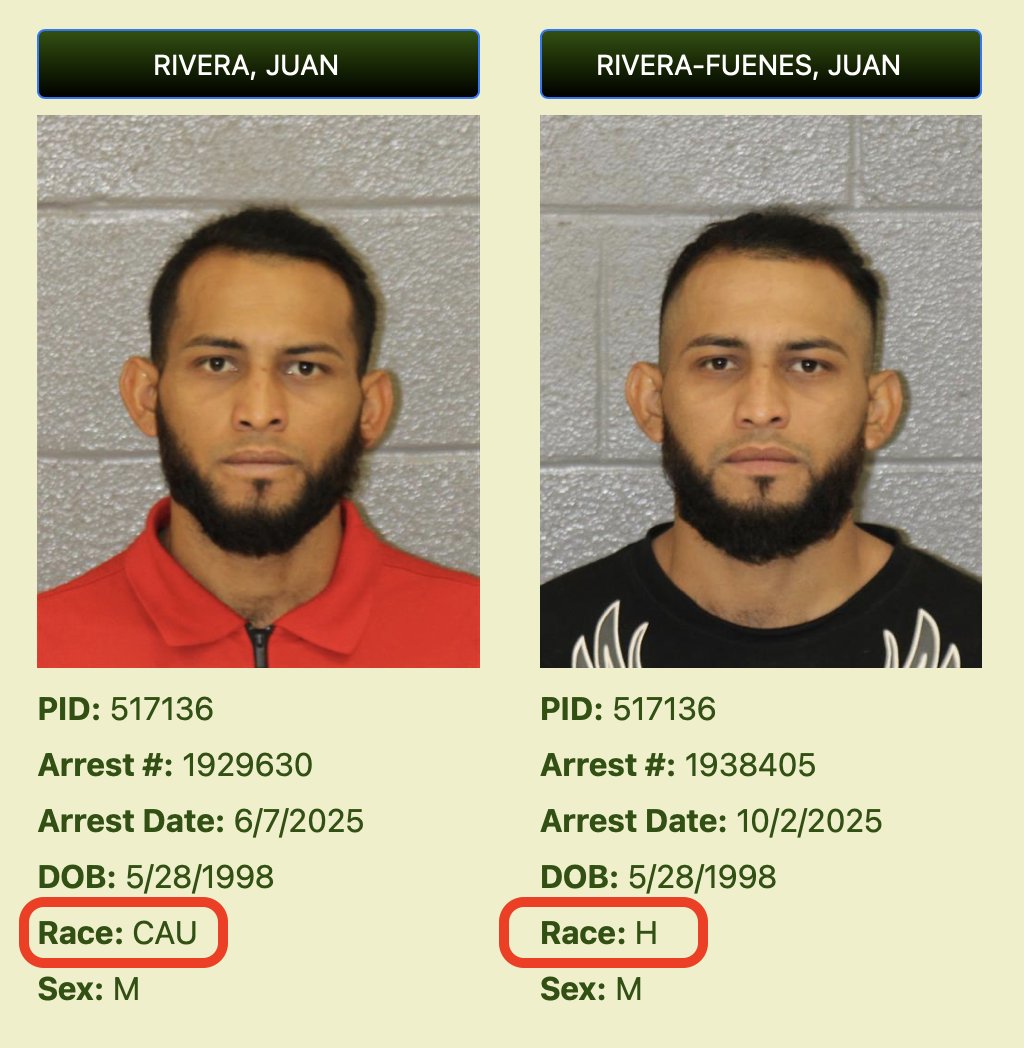 I have spent the last 72 hours running through thousands of arrest records in North Carolina. I've looked at something like 10,000 arrests. What I'm discovering is so shocking, so horrifying, it cannot be a coincidence. Hundreds of individuals are clearly being mislabeled in the arrest records system. It's not a one-off or remotely rare. There are hundreds of these, possibly thousands... just in North Carolina. The clearest and most damning examples are when a repeat offender is arrested multiple times and his race is obviously changed between arrests. I found at least 18 instances of this. Here's the kicker... it NEVER happens the other way. White men are NEVER labelled hispanic. Neither are black men. It's always hispanic (FOR WHICH THERE IS AN OPTION!!!) men being labelled a) Caucasian b) White c) Other d) Unknown Again, there is a CLEAR and often-used option to label an individual as Hispanic and it is deliberately not being used. EVEN WHEN the person has originally been arrested and labelled "H" = Hispanic. The 2nd, 3rd, 4th arrest will label them "Caucasian" I cannot think of any rational, reasonable explanation for why this is occurring, AT SCALE, in North Carolina. At the minimum, we cannot trust any race data coming out of North Carolina arrest records. If that data feeds into any federal system, we cannot trust this either. Even, for the sake of argument, if the data is NOT being intentionally manipulated... the data is clearly and wildly inaccurate. I am open to all explanations, but this looks like major data manipulation to me.