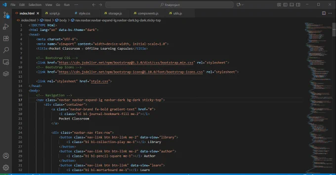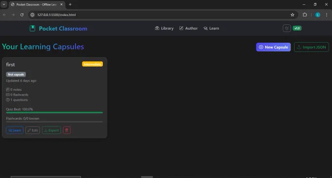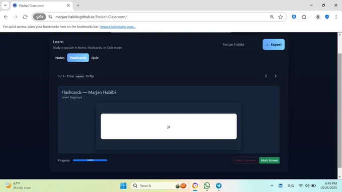 HTML, CSS, Bootstrap, JS. Offline learning capsules with notes, flashcards, and quizzes.