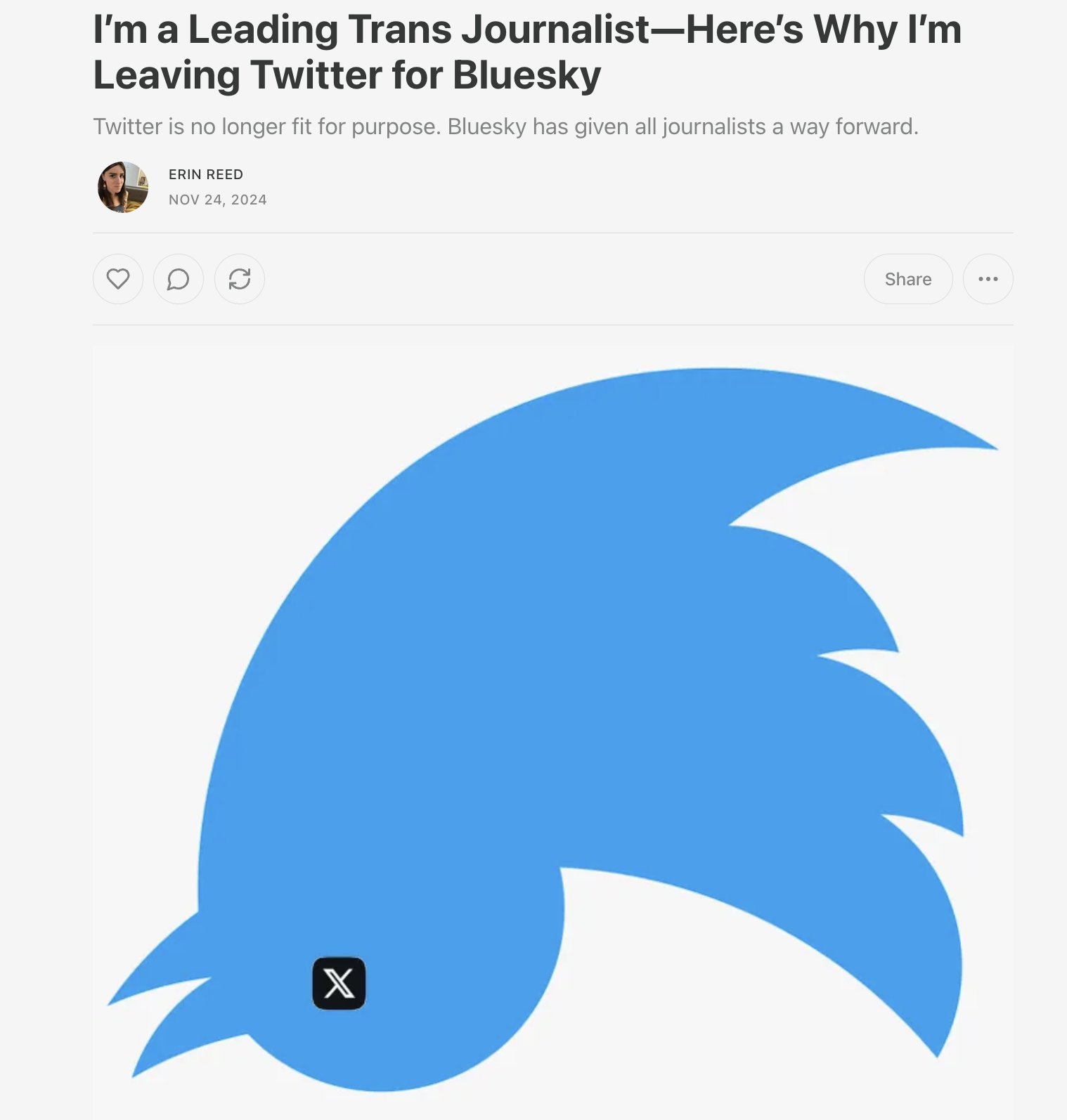 Lastly, you should know that my journalism will not continue here. Tomorrow is my last day on twitter, and I have a long article I will be releasing explaining why. You can always find it at the good place, bl*sky, Tiktok, Threads, IG video, and at erininthemorning.com/subscri….