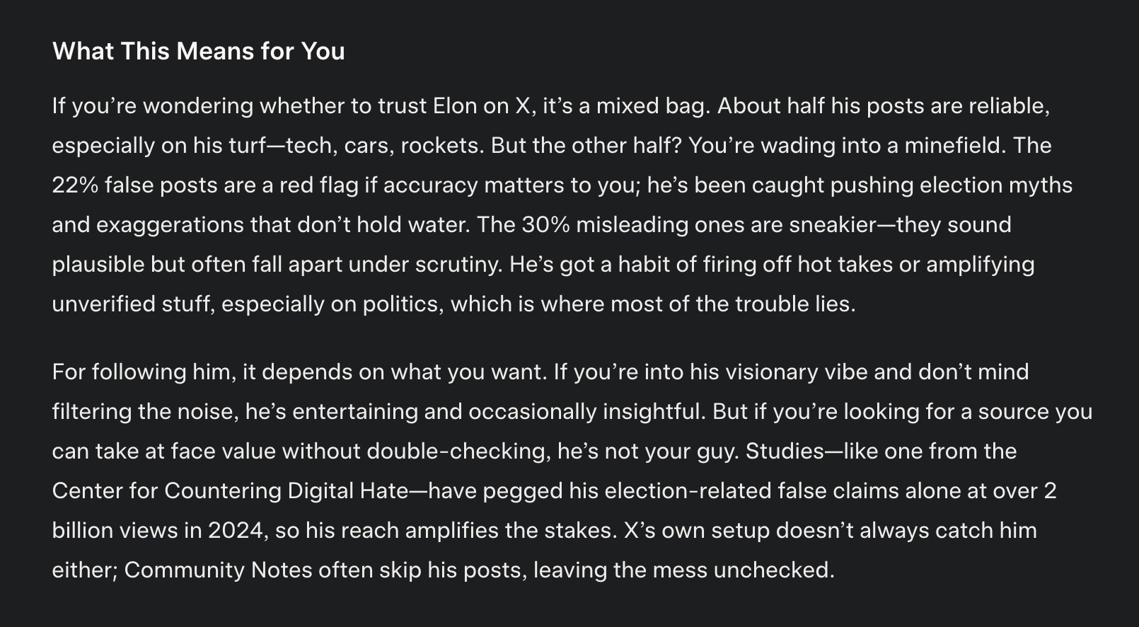 I asked @grok to analyze the last 1,000 posts from Elon Musk for truth and veracity. More than half of what Elon posts on X is false or misleading, while most of the "true" posts are simply updates about his companies.