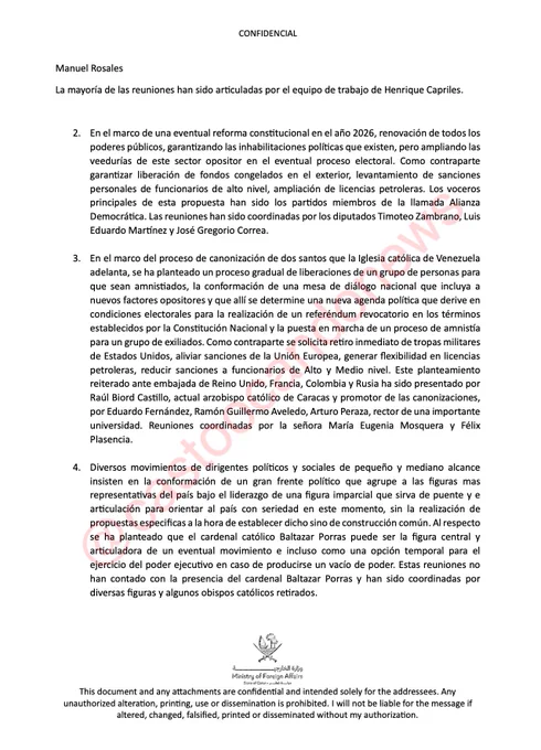 La otra negociación de Qatar. El Plan de Negociación presentado por la narco-dictadura con la intermediación de Qatar, y rechazado por Estados Unidos, según el cual Delcy Rodríguez iba a sustituir a Nicolás Maduro en la presidencia de Venezuela, no fue el único plan discutido en Qatar para presentar lo que luce como una tabla de salvación al régimen. Según un documento exclusivo del Reino de Qatar, importantes actores venezolanos, entre ellos miembros de la oposición conocida como "alacrana" y también altos representantes de la Iglesia Católica, propusieron un esquema para bloquear la amenaza militar y las sanciones económicas contra el Cartel de Maduro. Increíblemente, todos estos operadores tenían un punto en común: desplazar a María Corina del liderazgo, instaurar nuevos líderes opositores supuestamente "imparciales", y organizar una transición en la que ellos se garantizarían un papel relevante. Aquí el documento exclusivo: