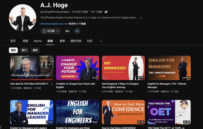 A.J. Hoge 是知名的英语学习播客《Effortless English》的创始人,他的播客内容都是围绕着非常基础的词汇展开,语速发音都非常友好,你完全不会感到烦躁。从油管到Spotify和Apple Podcasts都有他的号。