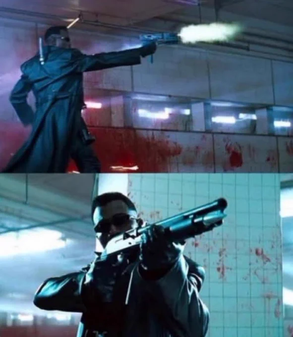In Blade (1998), the titular character can be seen using close-range weapons like custom SMGs, shotguns, and even a sword, but no long-distance rifles, which means there are no scenes where Wesley Snipes.
