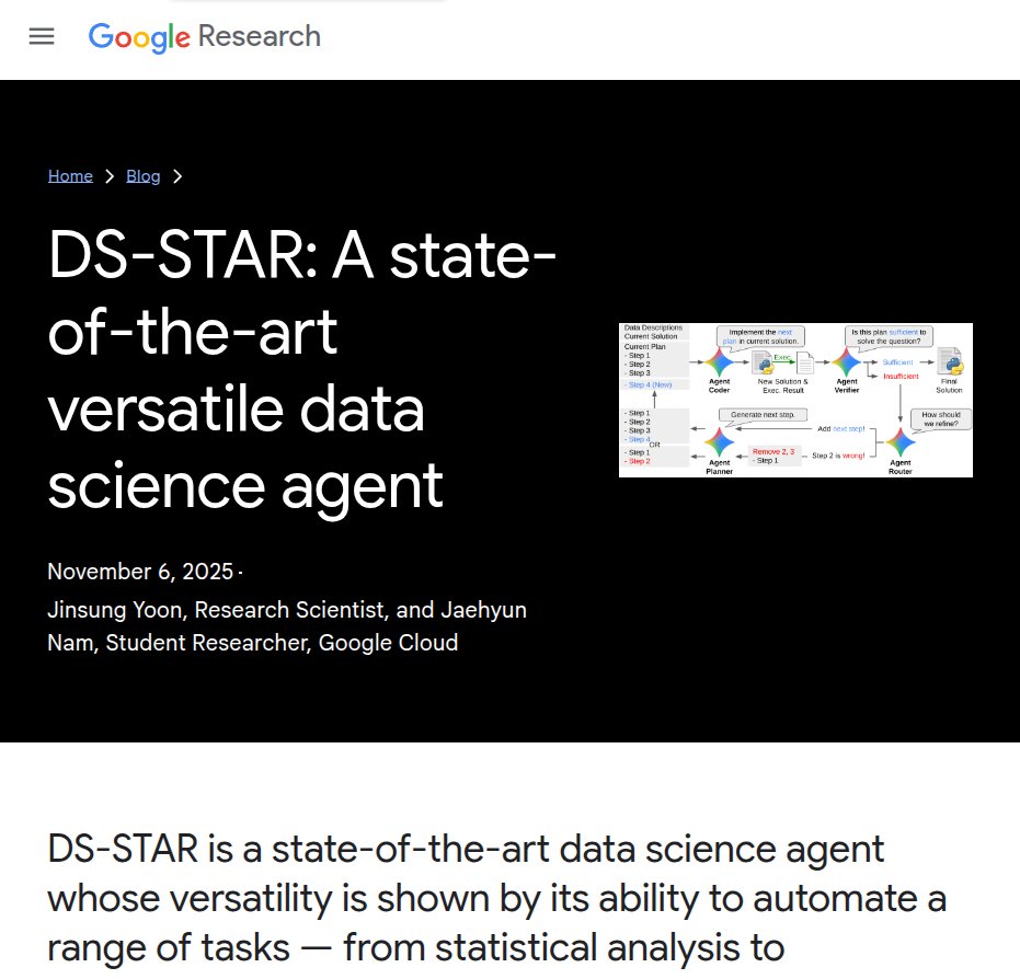 🧮 Google just published DS-STAR A data science agent that can automate a range of tasks — from statistical analysis to visualization and data wrangling. Reads messy files, plans steps, writes and runs code, and verifies itself, reaching state of the art on tough multi file tasks. It lifts accuracy to 45.2% on DABStep, 44.7% on KramaBench, and 38.5% on DA-Code, and holds first place on DABStep as of September-25. Earlier agents lean on clean CSVs and struggle when answers are split across JSON, markdown, and free text. DS-STAR begins by scanning a directory and producing a plain language summary of each file’s structure and contents that becomes shared context. A Planner proposes steps, a Coder writes Python, a Verifier checks sufficiency, a Router fixes mistakes or adds steps, and the loop stops when it passes or reaches 10 rounds. This setup handles heterogeneous data because the summaries surface schema, types, keys, and hints, so plans refer to real fields instead of guessing. On benchmarks the gains are steady, moving from 41.0% to 45.2% on DABStep, 39.8% to 44.7% on KramaBench, and 37.0% to 38.5% on DA-Code. Ablations explain the lift, removing the Data File Analyzer drops hard task accuracy on DABStep to 26.98%, and removing the Router also hurts across easy and hard tasks. Refinement depth matches difficulty, hard tasks average 5.6 rounds, easy tasks average 3.0 rounds, and over 50% of easy tasks finish in 1 round. The framework generalizes across base models, with a GPT-5 version doing better on easy items and a Gemini-2.5-Pro version doing better on hard items. Net effect, DS-STAR reduces the gap between messy data and reliable answers across CSV, XLSX, JSON, markdown, and plain text.