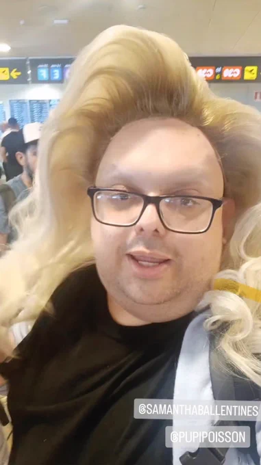 Que a @lamariaedilia le han dicho q solo puede llevar UN BULTO (lleva una mochila y una bolsa con su peluca) y ha tenido que sacar la peluca de la bolsa y ponérsela para entrar en el avión 🤣🤣🤣