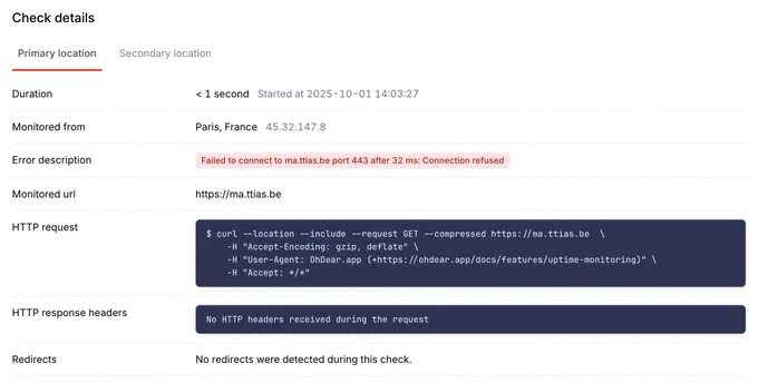 A small but useful update to our Uptime report page: if we detect downtime, we'll cleanly separate the responses from both our primary & secondary location in tabs 👏