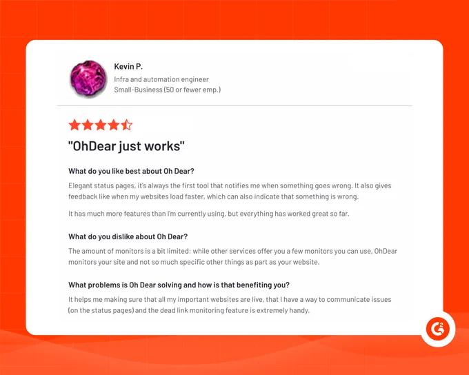 If you’ve had a good experience with Oh Dear, leaving a review on @G2dotcom goes a long way.