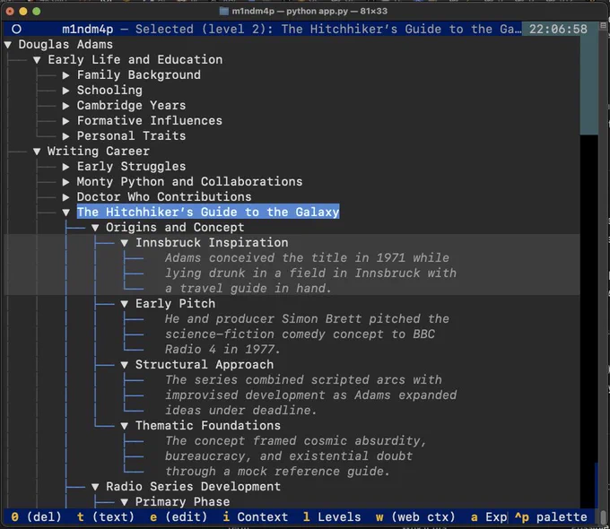 [ i ] opens a window to simply paste context. As PoC I pasted sama's tweet and simply added "tldr;" in the root → followed by [ ? ] to let m1ndm4p decide on the number of nodes → followed by [ ft ] = "full text" to add a text box to each node.