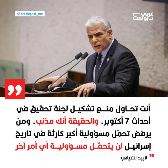 ⛔️ لابيد لـ #نتنياهو: أنت تفعل كل ما بوسعك لمنع تشكيل لجنة تحقيق رسمية في أحداث 7 أكتوبر، والحقيقة أنك مذنب، ومن يرفض تحمّل مسؤولية أكبر كارثة في تاريخ #إسرائيل لن يتحمّل مسؤولية أي أمر آخر.