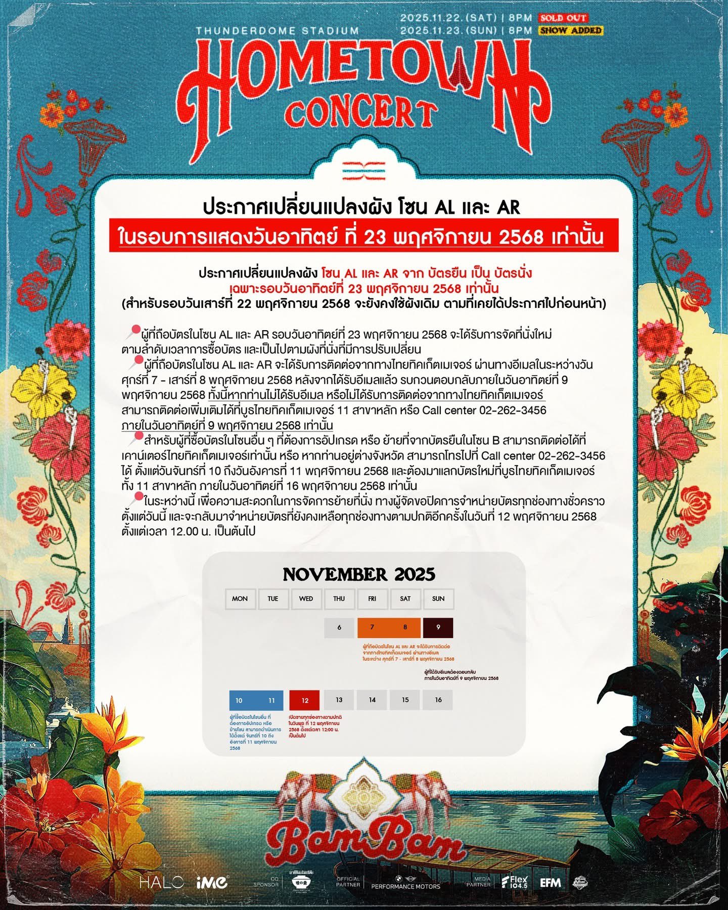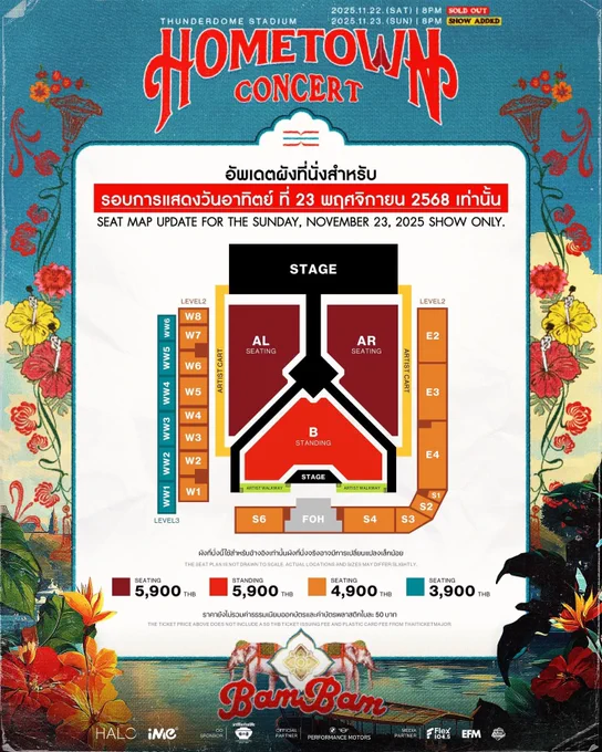 เช้านี้ฝากทุกคนกระจายข่าว 2025 BamBam HOMETOWN Concert in Bangkok *รอบการแสดงวันอาทิตย์ที่ 23 พฤศจิกายน 2568 ที่มีการเปลี่ยนแปลงผัง โซน AL และ AR จากบัตรยืน เป็นบัตรนั่ง *และกลับมาจำหน่ายบัตรที่ยังคงเหลือตามปกติอีกครั้งในวันที่ 12 พฤศจิกายน 2568 ตั้งแต่เวลา 12.00 น. D-14 HOMETOWN CONCERT #BamBam #뱀뱀 @BamBam1A @BAMBAMxBAMMIE