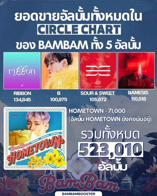 💿ยอดขายอัลบั้มทั้งหมดใน Circle Chart ของ #BamBam ทั้ง 5 อัลบั้ม [Update] 🎀 riBBon 134,845 🦢 B 100,975 🍋 Sour & Sweet 105,672 🚩 BAMESIS 110,518 🇹🇭 #HOMETOWN 71,000 🆕 รวมทั้งหมด 523,010 อัลบั้ม *อัลบั้ม #HOMETOWN ยังคงนับอยู่ #แบมแบม #뱀뱀 @BamBam1A @BAMBAMxBAMMIE