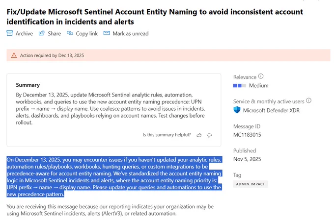 🚨 Fresh from the oven ... 🥐 Fellow MS defenders, MC1183015 just dropped a reminder to update Microsoft Sentinel analytic rules, automation, workbooks, and queries to use the new account entity naming precedence.