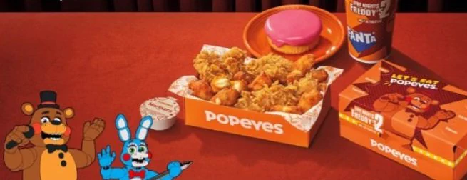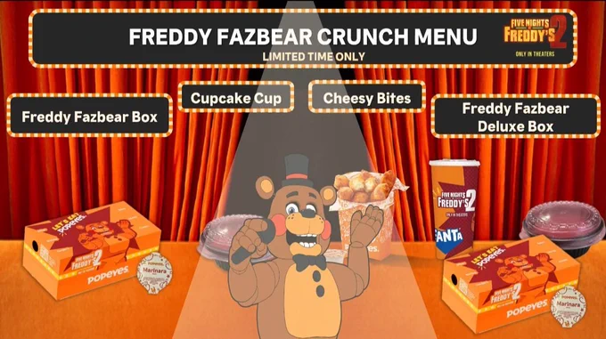 Closer looks at the 'FIVE NIGHTS AT FREDDY'S 2' Popeyes meal (Freddy Fazbear Crunch Menu) have been revealed!
