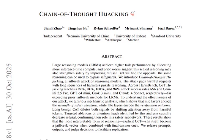 New Stanford+Anthropic paper shows long step-by-step prompts can break model safety and trigger harmful answers. 😟 Long reasoning can quietly neutralize safety checks that people assume are working. The trick adds a benign puzzle and long reasoning before the harmful ask, plus a final answer cue. This shifts attention to the puzzle tokens, so the harmful span gets less weight. The internal safety direction weakens, and the refusal behavior drops. Middle layers carry safety strength, later layers carry the final decision, both shrink with longer chains. Switching off key attention heads lowers refusals further, which matches the theory. On a public model, short reasoning hit 27% attack success, long reasoning reached about 80%. Across frontier systems, the method hits up to 99% success. So scaled reasoning boosts accuracy but also opens a new jailbreak path. ---- Paper – arxiv. org/abs/2510.26418 Paper Title: "Chain-of-Thought Hijacking"